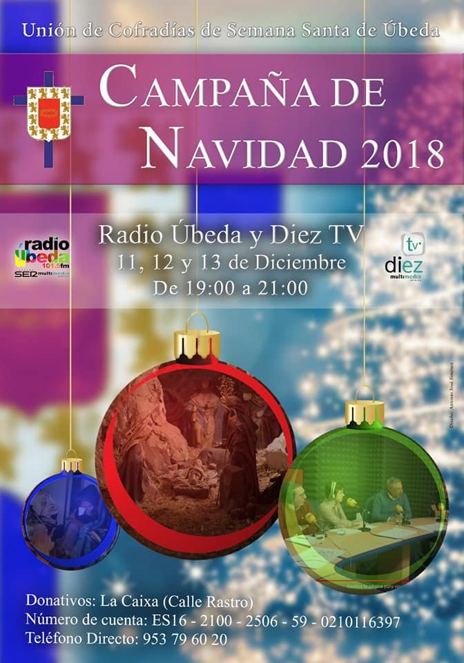 Un año más nos unimos a la tradicional Campaña de Navidad de Radio Úbeda y la Unión de Cofradías. Nuestro día fue el Jueves 13 de diciembre entre las 19 h y 20 h. Este año la recaudación ha sido para los siguientes colectivos: